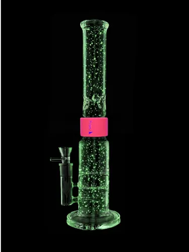 The Glow Big Honeycomb Single Stack features a UV-activated splatter design that lights up under blacklight. With our custom bong system, it’s easy to clean, swap parts, customize, and pack for any adventure. This robust setup offers milky smooth hits with its two honeycomb percolators and a straight percolator fixed downstem that ensures even smoke distribution. Enjoy a glowing look and effortless convenience with every session!